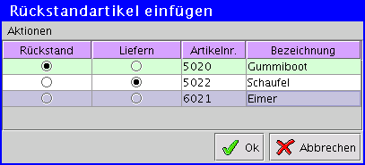 Die folgende Abbildung zeigt den Dialog zur automatischen Erzeugung von Rückstandspositionen. Hier soll für den ersten Artikel eine Rückstandsposition, für den zweiten eine Artikelposition und für den dritten Artikel nichts eingefügt werden.