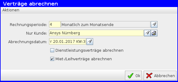 Benutzerdialog für Abrechnung von Miet-/Leihverträgen