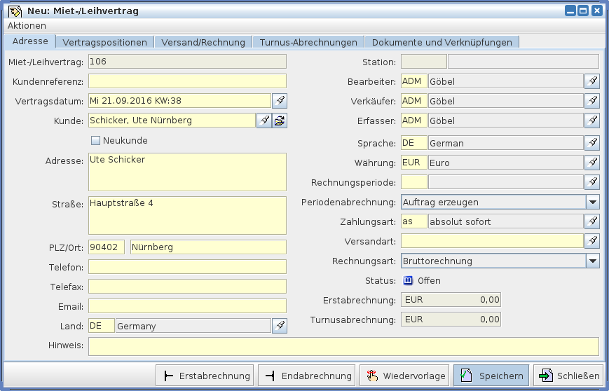 Haben Sie alle Daten des Miet-/Leihvertrags eingegeben oder verändert und sollen diese im System gespeichert werden, dann klicken Sie die Schaltfläche [Speichern] mit der linken Maustaste an oder betätigen die Tastenkombination Strg-E. Damit werden alle Daten wie angezeigt zu dem Miet-/Leihvertrag gespeichert.