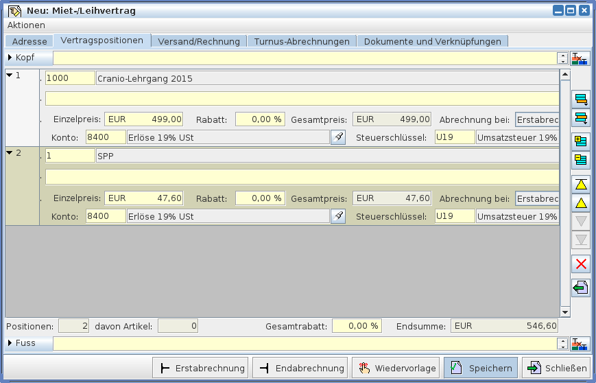 Die Karteikarte „Vertragspositionen“ erfasst den Umfang des Vertrags in Listenform.