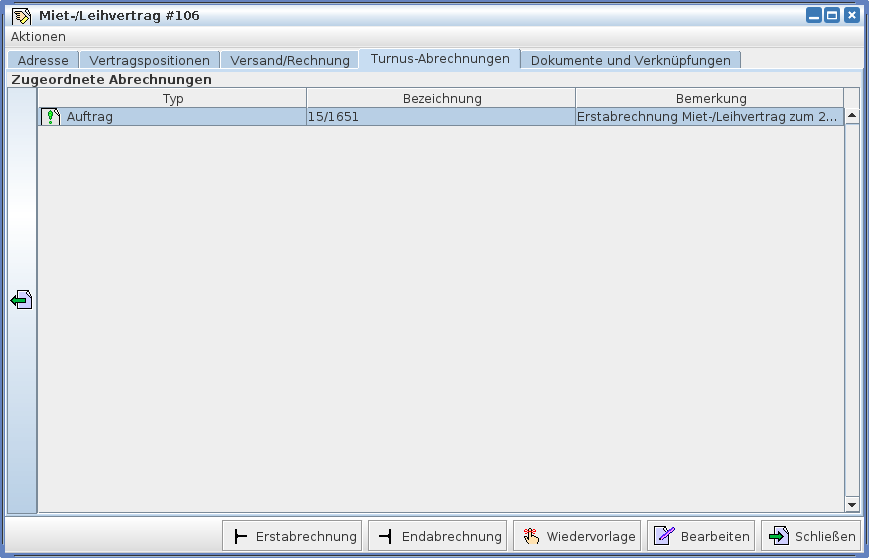 Das nächste Bild zeigt die Karteikarte „Abrechnungen“ eines Miet-Leihvertrags mit Erstabrechnung und einer verknüpften Monatsabrechnung.