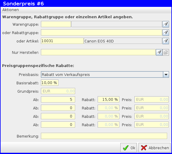 Nun kann man die Warengruppe, Rabattgruppe oder den einzelnen Artikel ändern und/oder hinzufügen. Oder man wählt nur einen bestimmten Hersteller aus.