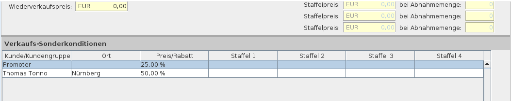 Bei den Verkaufs-Sonderkonditionen ein Feld darunter kann man eine Kundengruppe eintragen. Hier sieht man auch Kunden, die für diesen Artikel extra einen Rabatt erhalten.