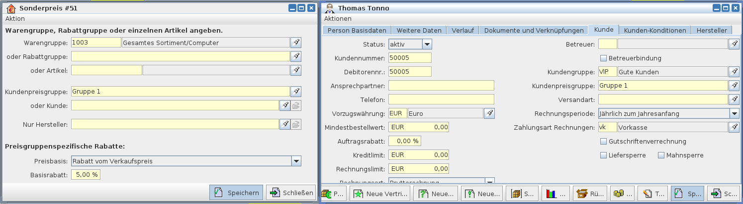 Zuerst einmal sollte ein Kundensonderpreis vorhanden sein. In diesem Fallbeispiel wurde ein Kundensonderpreis mit einem Rabatt von 5% auf den Verkaufspreis für alle Kunden in der Kundenpreisgruppe "Gruppe 1" auf die Warengruppe "1003 Computer" erstellt. Im folgenden Bild sieht man auf der linken Seite einmal den Kundensonderpreis und auf der rechten Seite einen Kunden, der zur der angegeben Kundengruppe gehört.
