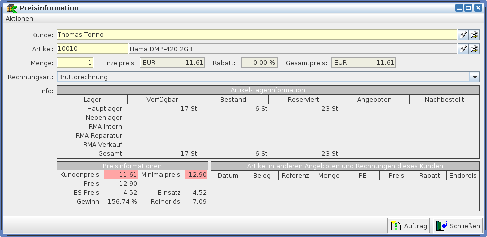 Eine wichtige Rolle spielt die Preisinformation aber vor allem in der Preisfindung. So kann man nach Eingabe des Kundennamen und des Artikels, sich den für den Kunden derzeit bestehenden Sonderpreis anzeigen lassen.