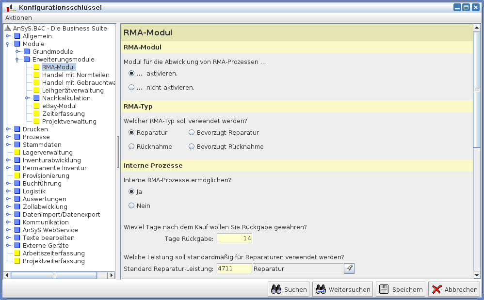 Nachdem die Leistung angelegt wurde, können Sie nun das RMA-Modul aktivieren. Gehen Sie dazu ins Einrichtungsmodul und wählen Sie im Menü "Verwaltung" den Menüpunkt "Konfiguration". Klicken Sie nun auf der unteren Leiste des geöffneten Fensters auf "Suchen" und tippen sie "RMA-Modul" ein. Auf der rechten Seite sollte die Konfiguration des RMA-Moduls erscheinen. Klicken Sie dort bei "Modul für die Abwicklung von RMA-Prozessen ..." auf "aktivieren". Als "RMA-Typ" wählen Sie bitte "Reparatur". Zuletzt müssen Sie noch die anfangs angelegte Leistung als Standard festlegen. Benutzen Sie dazu den Picker neben "Standard Reparatur-Leistung". Speichern Sie nun die geänderte Konfiguration ab, indem Sie rechts unten die "Speichern"-Schaltfläche betätigen.