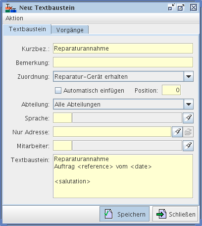 Nachdem Sie die Zuordnung bestimmt haben, vergeben Sie dem Textbaustein eine treffende Kurzbezeichnung (im Feld "Kurzbez."). Optional können Sie auch noch eine Bemerkung hinzufügen. Am unteren Ende des Dialogs befindet sich das Feld "Textbaustein", in dem Sie das eigentliche Dokument recht frei gestalten können. Beachten Sie, dass die erste Zeile als Überschrift gedacht ist und im späteren Brief größer und fett gedruckt erscheint. Adresse, Ort und Datum werden automatisch oberhalb des hier verfassten Textes eingefügt. Weiterhin stehen Ihnen für den Text eine Reihe von Platzhaltern zur Verfügung, die weiter unten aufgelistet werden. Diese Platzhalter haben die Form "<'Name des Platzhalters'>" und werden später durch das Programm mit den Werten des jeweiligen Reparaturvorgangs gefüllt. Schreiben Sie bsw. "<salutation>", so wird dieser Platzhalter durch die Anrede (engl.: salutation) also "Sehr geehrte Damen und Herren," ersetzt.