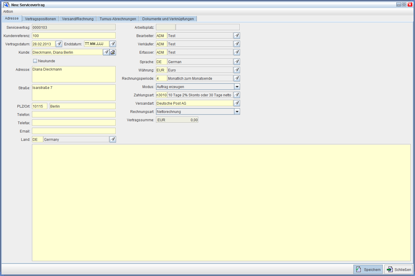 Haben Sie alle Daten des Servicevertrags eingegeben oder verändert und sollen diese im System gespeichert werden, dann klicken Sie die Schaltfläche [Speichern] mit der linken Maustaste an oder betätigen die Tastenkombination Strg-E. Damit werden alle Daten wie angezeigt zu dem Servicevertrag gespeichert.