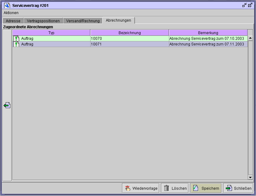 Auf der Karteikarte „Abrechnungen“ haben Sie generell keine Eingaben zu machen. Die dort enthaltene Tabelle dient der Übersicht. Sie sehen in der Tabelle eine Liste der Aufträge aller im Zusammenhang mit dem ausgewählten Servicevertrag erfolgten Abrechnungen.