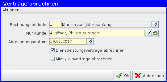 Zum Abrechnen von Serviceverträgen verwenden Sie den Menüpunkt „Verträge abrechnen“ des Menüs „Verträge“.